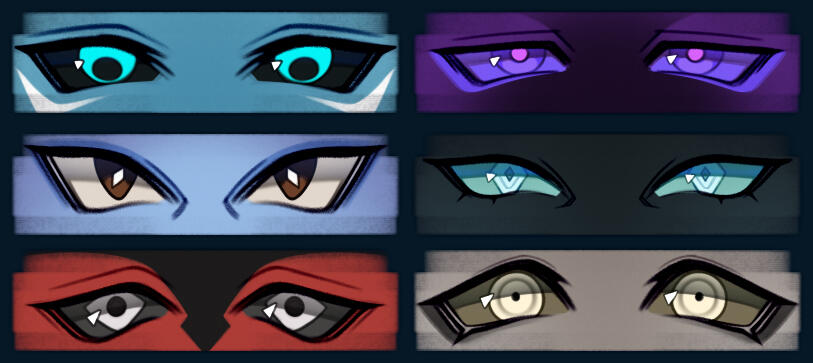 Eyes: Can have any shape, color, and pupil type, but never heterochromatic.